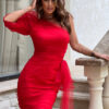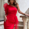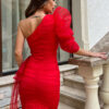 Elegancka sukienka na jedno ramię w intensywnym kolorze czerwonym. Asymetryczny fason nadaje jej unikalny charakter a marszczony rękaw oraz starannie wykonana kokarda w pasie dodają szyku i wyrafinowania. Doskonała na wyjątkowe okazje