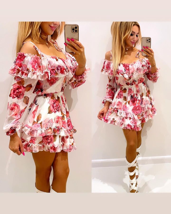 Biała w różowe kwiaty sukienka hiszpanka. Model 200-008