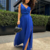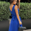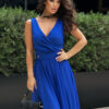 “Elegancka sukienka o długości maxi, uszyta z wyjątkowo zwiewnej tkaniny. Góra tej kreacji zachwyca delikatnym dekoltem, który dodaje subtelności. Dwuwarstwowy dół sukienki ozdobiony jest efektownym wycięciem na nodze, co nadaje kreacji powabu i sprawia, że jest doskonała na specjalne okazje. Dodatkowo, sukienka jest wyposażona w pasujący pasek, który podkreśla talię.