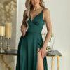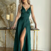 Długa satynowa suknia z wycięciem na nodze i delikatnych ramiączkach w kolorze butelkowej zieleni. Model 200-067