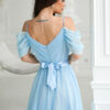 Niebiańska Elegancja: Długa Sukienka Hiszpanka w Odcieniu Błękitu z Tiulowymi Rękawami i Satynowym Paskiem