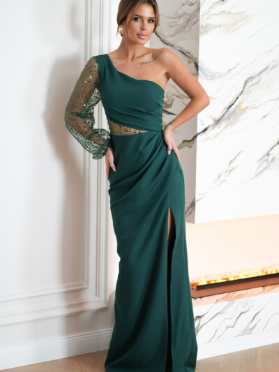 Asymetryczna suknia z cekinowym rękawem w kolorze butelkowej zieleni. Model 200-0145
