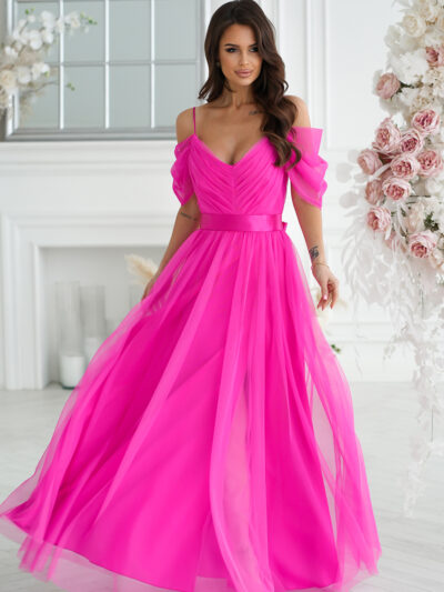 Długa satynowa suknia z rozcięciem na nodze. Kolor brudny róż.