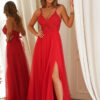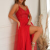 Ta ognista czerwona suknia to połączenie wyjątkowego uroku koronki z lekkością tiulu, tworząc niezwykle efektowny i romantyczny look. Góra sukni zdobiona delikatną koronką dodaje subtelności i wyjątkowego uroku, podczas gdy dół składa się z kilku warstw tiulu, nadając sukni lekkości i elegancji.