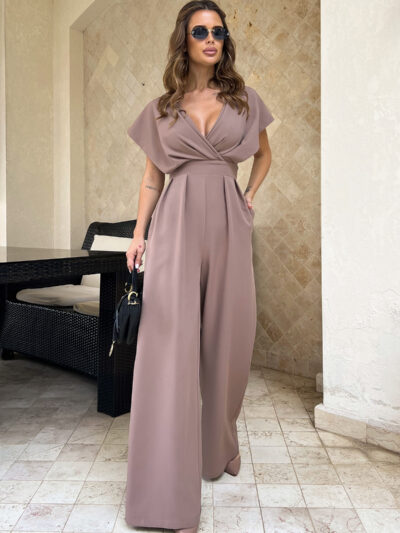 Elegancki kombinezon w kolorze malinowym z zakrytymi ramionami. Model 200-057