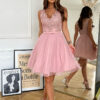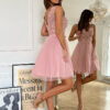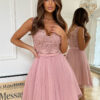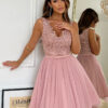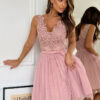 Krótka sukienka w kolorze brudnego różu z delikatną koronkowa górą i kokardką. Model 200-065