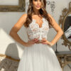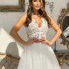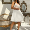 Krótka sukienka z beżową górą wykończoną biała koronką i delikatnie rozkloszowanym tiulowym dołem. Model 200-053