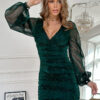 Zanuć symfonię wyrafinowanej elegancji z mini sukienką w odcieniu butelkowej zieleni, która wzbudza zachwyt swoją precyzją wykonania i unikalnym stylem. Stworzona z najwyższej jakości tkaniny w subtelnej butelkowej zieleni, ta kreacja urzeka dekoracyjnymi, eleganckimi rękawami oraz misternie wykończonymi marszczeniami. Perfekcyjnie przylega do sylwetki, subtelnie eksponując biust poprzez delikatnie wycięty dekolt typu serek.