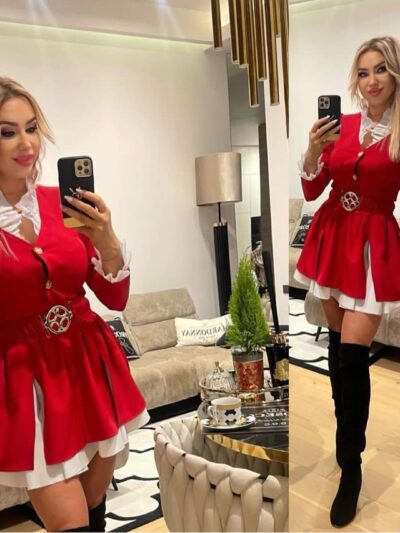 Elegancka czerwona sukienka z białymi dodatkami. Model 200-0153