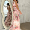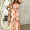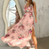 Różowa długa suknia w kwiaty z delikatnym dekoltem i rozcięciem na nodze. Model 200-047