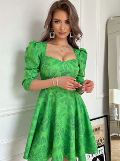 Rozkloszowana sukienka z bufiastymi rękawami zielona. Model 200-040