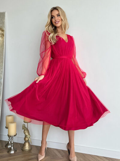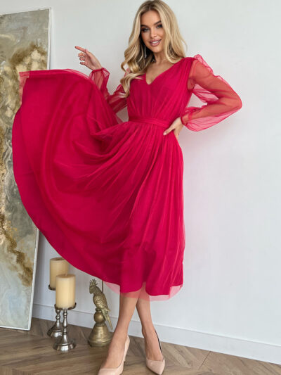 Długa suknia satynowa na jedno ramie z marszczeniami w kolorze fuksji. Model 200-082