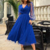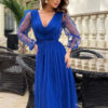 Sukienka midi o wytwornym odcieniu chabrowym to wybór pełen klasy. Jej rozkloszowana spódnica i subtelną, brokatową siatkę dodają wyjątkowego wdzięku. Marszczona góra w połączeniu z długimi rękawami oraz eleganckim dekoltem w kształcie serca tworzą kompozycję o niezwykłym uroku, idealną na wyjątkowe okazje