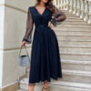 Sukienka midi w kolorze czarnym to elegancki wybór. Jej rozkloszowana spódnica i subtelnie zdobiona brokatowa siatka dodają wyjątkowego uroku. Marszczona góra w połączeniu z długimi rękawami oraz delikatnym dekoltem w kształcie serca tworzą wyrafinowaną kompozycję
