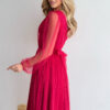 Nasza urocza sukienka midi w odważnym odcieniu fuksji emanuje doskonałą elegancją i wyrafinowanym stylem. Ta stylizacja przyciąga spojrzenia, zarówno na wyjątkowych okazjach, jak i w trakcie codziennych spotkań.