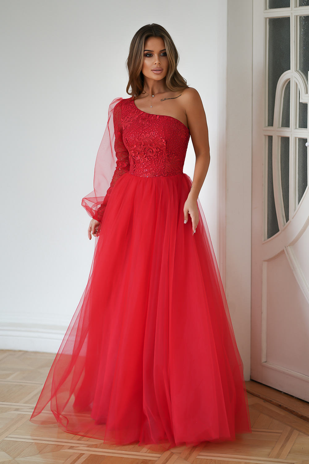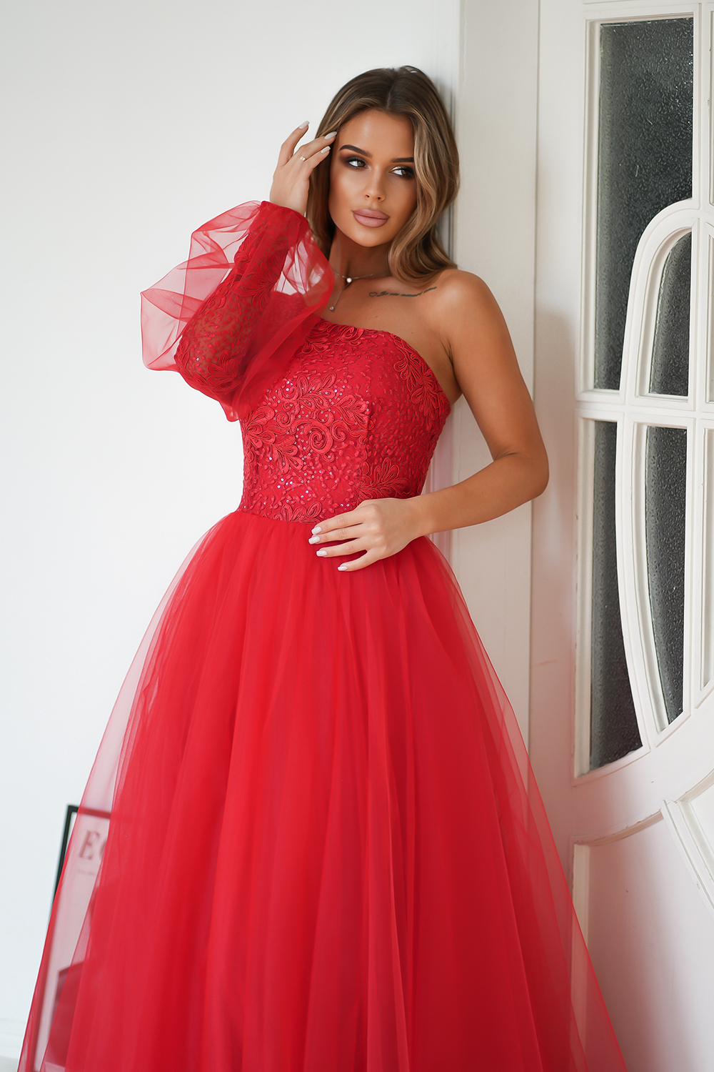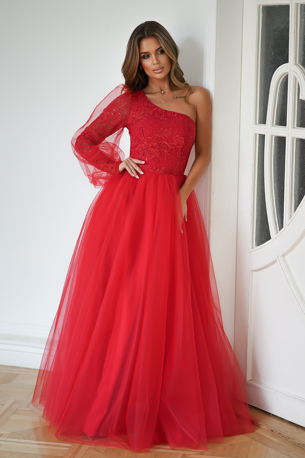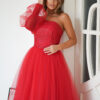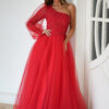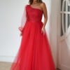 Ta urzekająca sukienka balowa w intensywnym czerwonym kolorze, z jednym rękawem, jest symbolem niepowtarzalnej elegancji i finezji. Delikatna koronkowa góra, subtelnie mieniąca się, współgra perfekcyjnie z minimalistyczną siateczką na rękawie, nadając całości niezwykłego charakteru. Rozkloszowany dół, wykonany z warstwowo uszytej, sztywnej siatki, dodaje sukience objętości i lekkości w tańcu. Czerwona suknia balowa to wybór dla osób ceniących elegancję i swobodę podczas wyjątkowych wydarzeń, emanując niezaprzeczalnym wdziękiem i stylem.