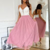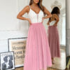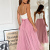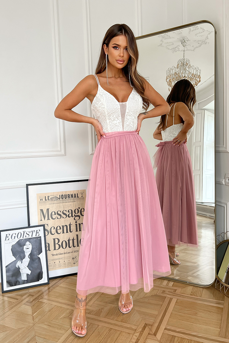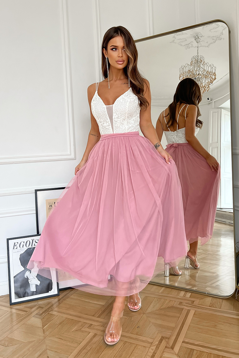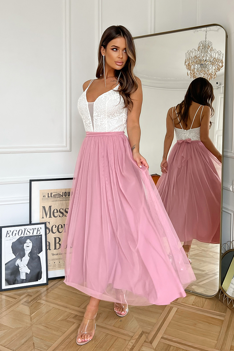 Suknia z białą koronkową górą na delikatnych ramiączkach i tiulowym dołem. Model 200-052