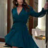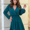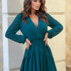 Sukienka, utrzymana w głębokim odcieniu butelkowej zieleni, stanowi przykład wyrafinowanej elegancji. Jest ona ozdobiona dyskretnymi, groszkami, które nadają jej subtelności i wyjątkowego blasku. Wydłużony tył sukienki dodaje lekkości całej kreacji. Górna część sukienki została zaprojektowana z dekoltem w serek oraz długimi rękawami, zakończonymi elastyczną gumką. Ten niezwykle głęboki odcień butelkowej zieleni przyczynia się do stworzenia wyjątkowego wrażenia, co czyni tę sukienkę nie tylko modnym wyborem, ale także wyrazem profesjonalnej elegancji.