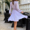 Sukienka z lekkiego szyfonu, zdobiona efektownymi groszkami. Subtelnie wydłużony tył nadaje jej delikatności. Górna część ma dekolt w serek i długie rękawy zakończone elastyczną gumką. Prezentuje się wyjątkowo urokliwie.