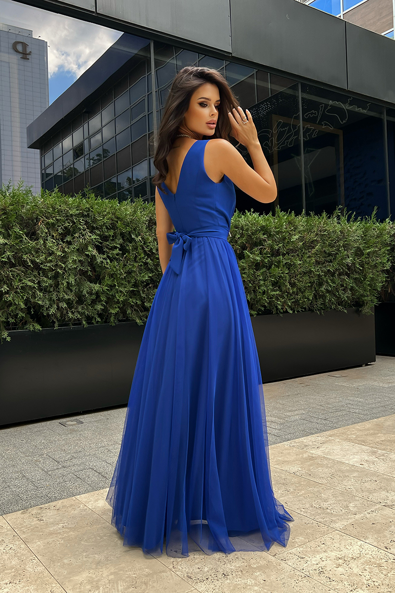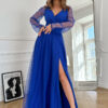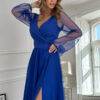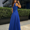 Ta długa sukienka w odcieniu chabrowym to niezwykłe połączenie elegancji, wygody i niepowtarzalnego designu. Jej zwiewna tkanina doskonale współgra z delikatnym dekoltem na górze oraz dwuwarstwowym dołem, który zachwyca subtelnie wyprofilowanym wycięciem na nodze, dodając sukience niezwykłej finezji. Pasek, którym jest wyposażona, perfekcyjnie podkreśla talię, nadając całej stylizacji wyjątkowego charakteru.